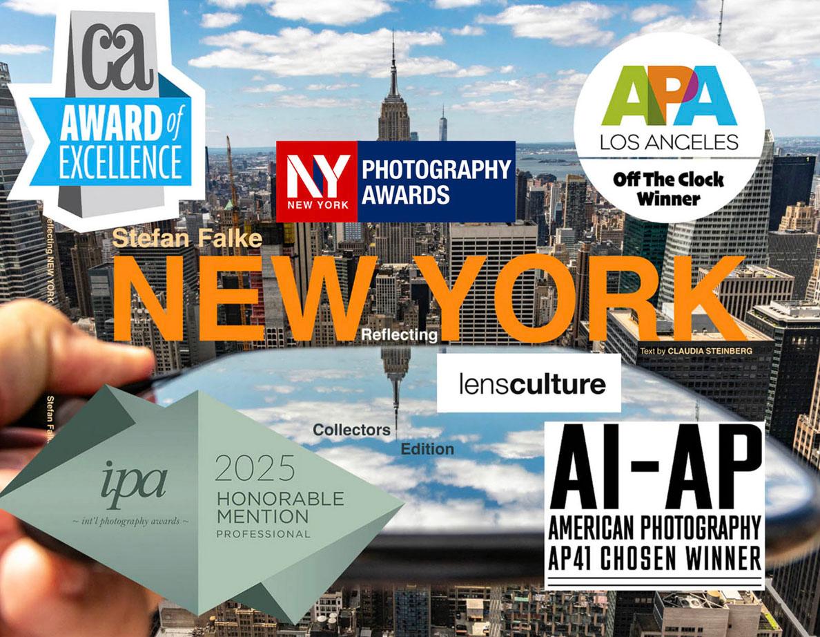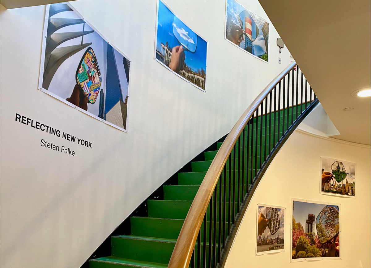 Using a hand held mirror in locations around New York award winning photographer Stefan Falke invites distant buildings, structures or other visuals into the main photo to create a viewing experience that requires a second look. At times the reflection in the mirror becomes the main photo. His goal is to visually loosen up the obvious, to create images that will surprise and intrigue the viewer, and himself.